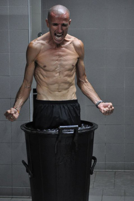 “Y para terminar, un ratito en la cubeta de agua con hielo. Se pasa un buen rato, ya que ves a tíos grandes y musculosos que entran en el cubo y cuando llevan 30 segundos, salen diciendo no sé qué palabras que no alcanzo a entender bien. Y al ver a un tipo esmirriado como yo que no parpadea hace que todavía suelten más improperios. Como digo, se pasa un buen rato. Hay un velocista de Trinidad y Tobago al que le tengo comida la moral...”
